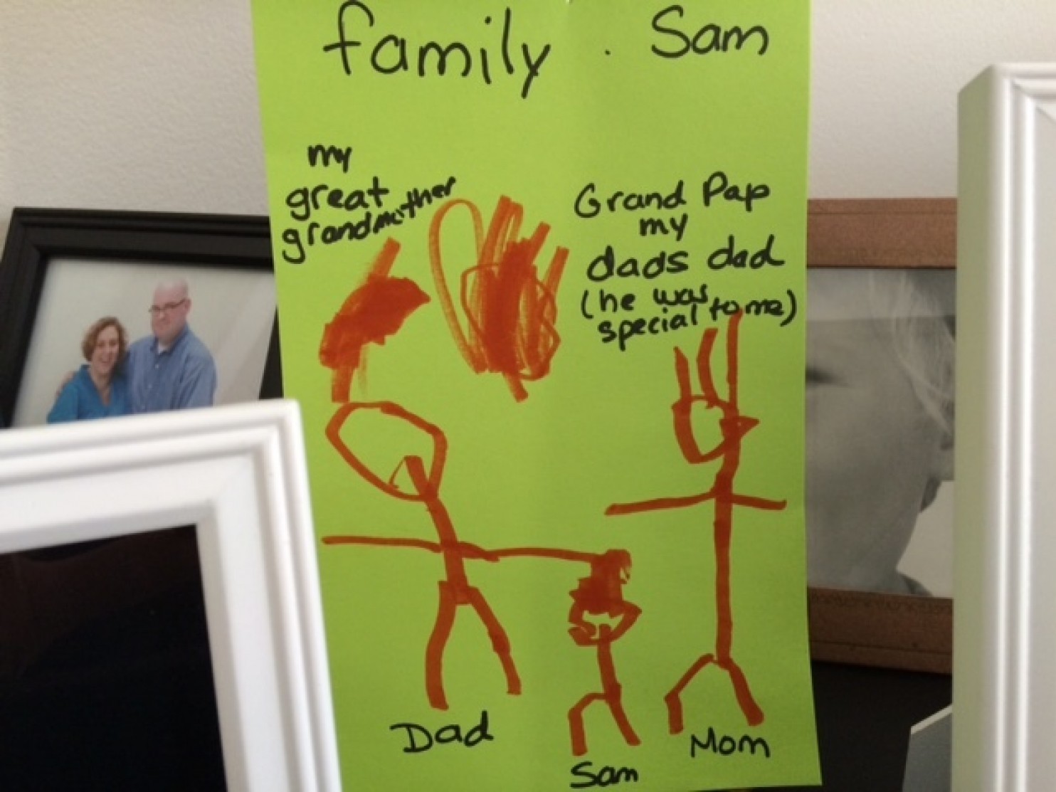 Our family, drawn on a piece of neon green paper with an orange marker, looked like your average stick-figure family. Mama on one side with spiky hair, Sam in the middle, tiny, and Dada on his other side, bald, and a bit taller than the two of us. Above our heads two orbs hovered, spirals of orange marker lines, with helpful notes from the teacher that Sam must have dictated: “My great-grandmother.” And over the other orb: “Grand-pap, my dad’s dad. He was special to me.”